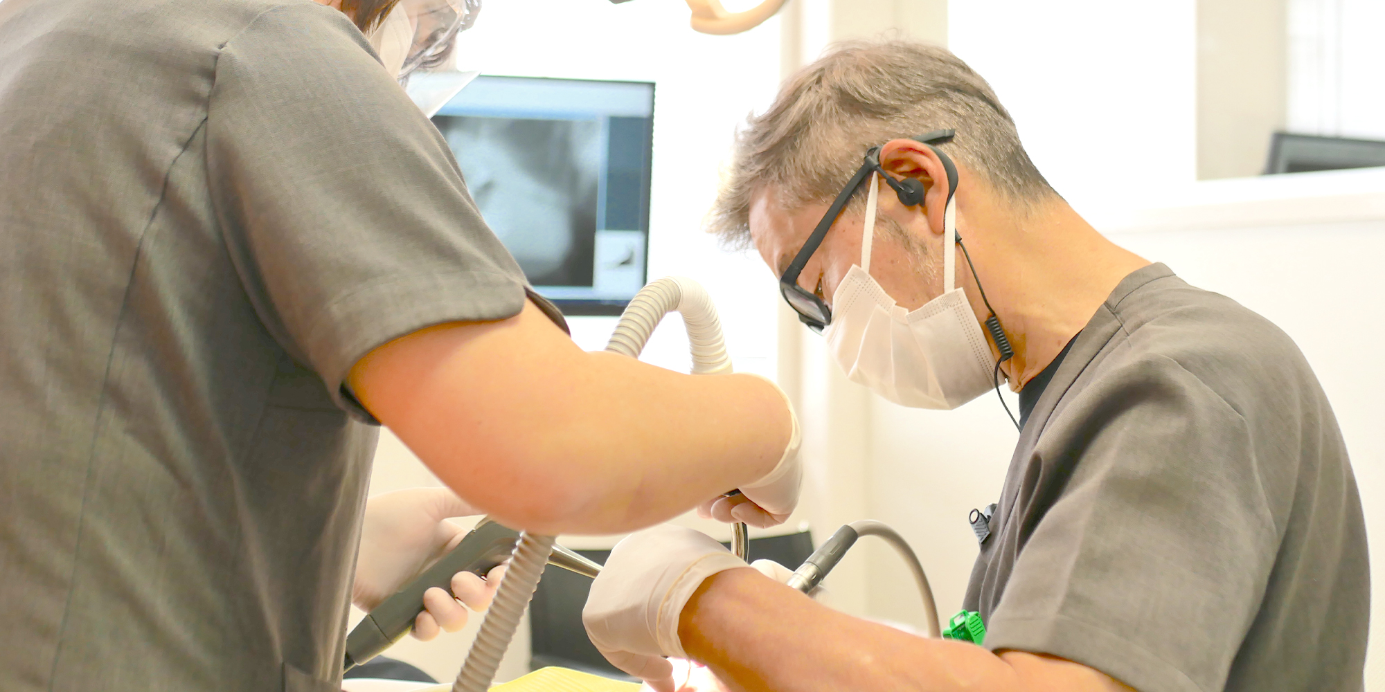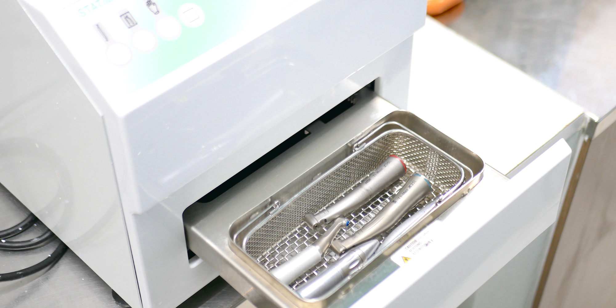 当院では、洗浄から滅菌までを全自動で行えるハンドピース専用のメンテナンス機器を導入し、細部まで衛生的に処理しています。治療中に飛び散るウイルスや細菌を含んだ唾液や歯の削りカスなどは、診療台に設置した口腔外バキュームで瞬時に吸い取り、院内の空気を清潔に保っています。